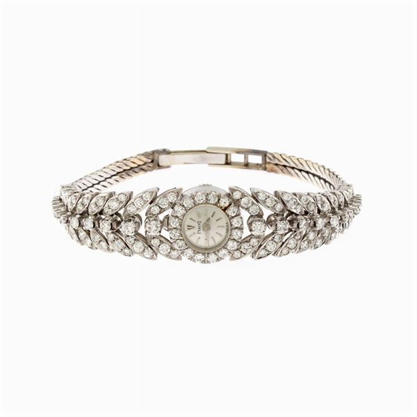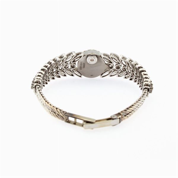 peso 31 gr.in oro bianco 18kt e diamanti taglio brillante ct 2,50 circa, ref. 2301 - 102128, cassa tonda 9 mm. circa, quadrante argentato con indici, corona di carica sul fondello, movimento meccanico a carica manuale, bracciale in oro bianco e diamanti, lunghezza regolabile 16 cm. cassa, quadrante e movimento firmati,