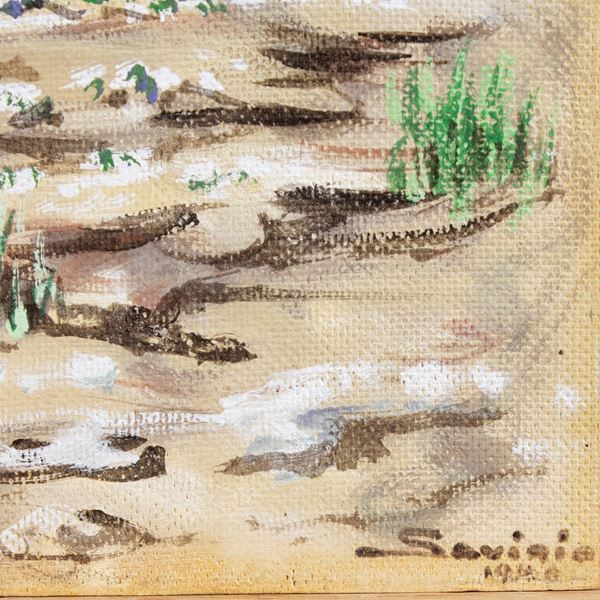 78x58 cm."Cavaliere alla fonte (omaggio ad Ariosto)", 1949, tempera su faesite, firmata e datata in basso a destra, titolata sul retro, entro cornice.