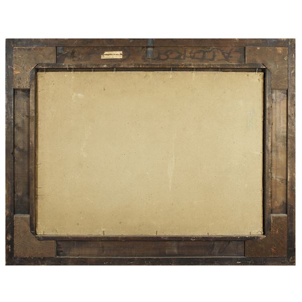 75x104 cm."La Cattedrale di Senlis", 1930 circa, olio su cartone, firmato in basso a destra, entro cornice