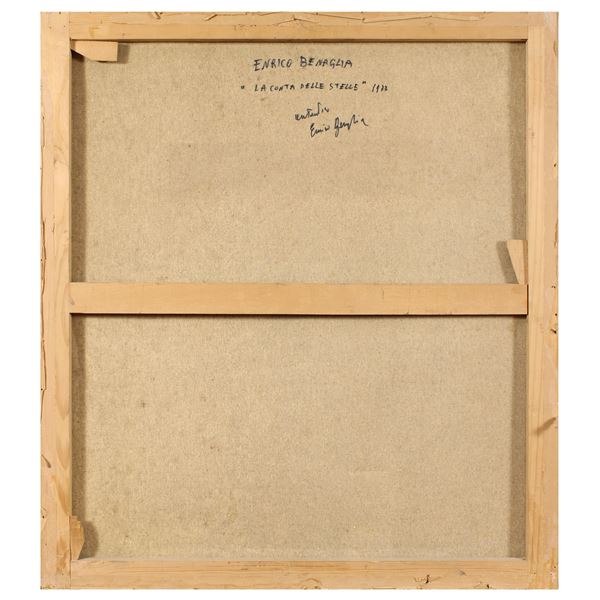 85x75 cm."La conta delle stelle", 1977, olio su tela, firmato e datato in basso a destra, firmato, titolato e datato sul retro