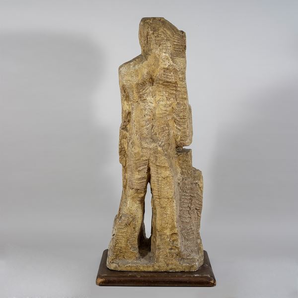 155x62x40 cm."Senza titolo", 1963, scultura in gesso poggiante su base in legno.