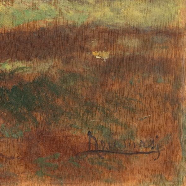 88x48 cm."Paesaggio con bosco", olio su compensato, firmato in basso a destra, dedica sul retro, entro cornice