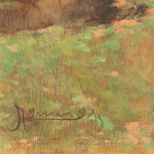 "Paesaggio autunnale", olio su compensato, firmato in basso a destra, dedica sul retro, entro cornice