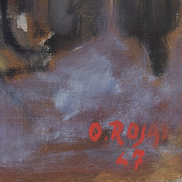 55,5x45,5 cm."Orchestrina",1947, olio su tela, firmato in basso e datato in basso a destra, entro cornice.