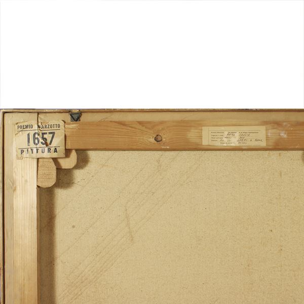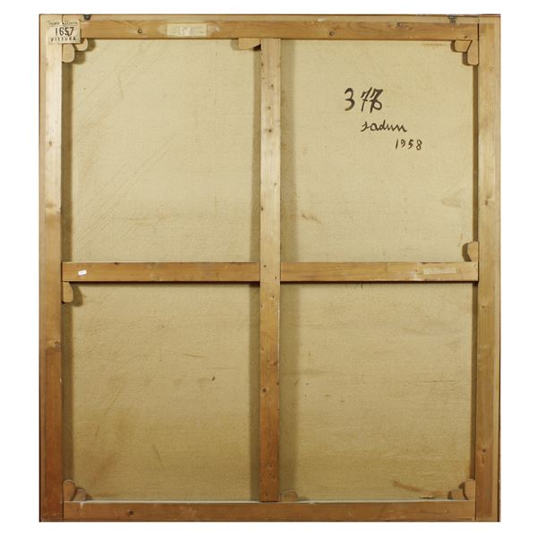 165x145 cm."Spazio - 377", 1958, olio su tela, firmato, datato e titolato sul retro, difetti
