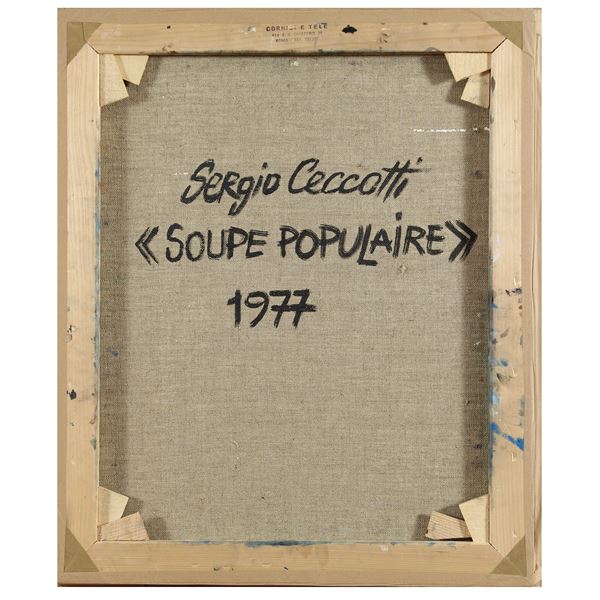 60x50 cm."Soupe Populaire", 1977, olio su tela, siglato e datato a sinistra, firmato, datato e titolato sul retro, entro cornice