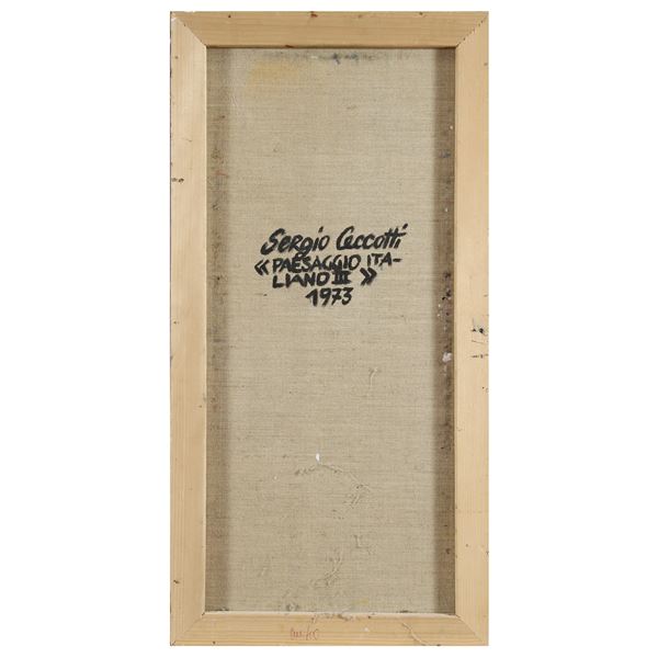 80x40 cm."Paesaggio italiano III", 1973, olio su tela, siglato e datato a destra, firmato, datato e titolato sul retro, entro cornice