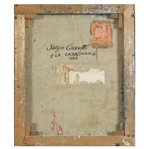 60x50 cm."La casalinga", 1964, olio su tela, siglato e datato in alto a sinistra, firmato, datato e titolato sul retro, entro cornice