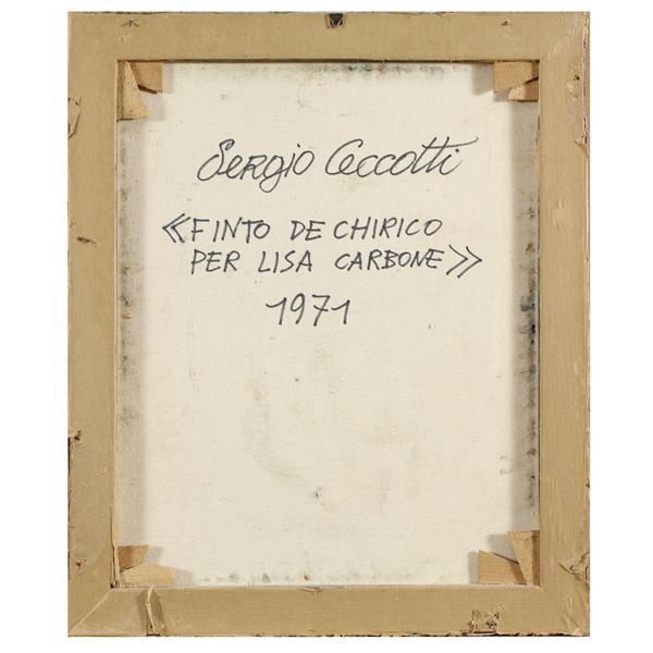 60x50 cm."Finto De Chirico per Lisa Carbone", 1971, olio su tela, siglato e datato in alto a destra, firmato, datato e titolato sul retro, entro cornice