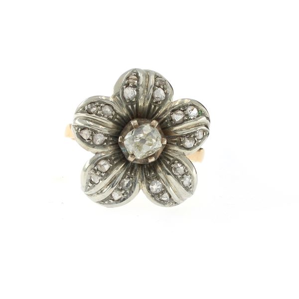 Antico anello fiore in oro giallo 9kt e argento rosa coroné