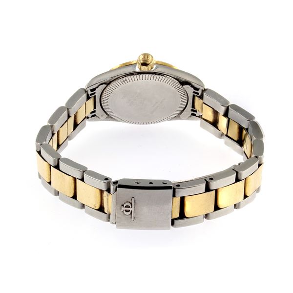 peso 42 gr.in acciaio e oro, cassa tonda 25 mm. quadrante bianco con numeri romani, datario ore 3, ghiera zigrinata, movimento al quarzo, bracciale in acciaio e oro con chiusura deployante