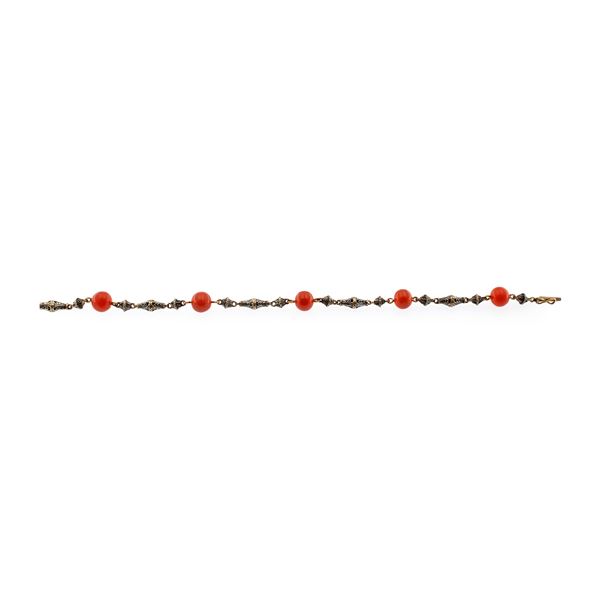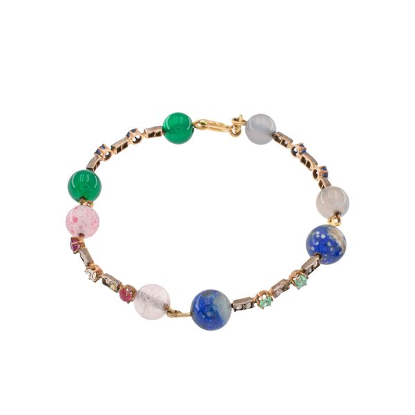 peso 21 gr.rispettivamente uno in corallo e l'altro con sfere di pietre dure alternate da rose di diamante, rubini, zaffiri e smeraldi tondi, mancanze, lunghezza 17 cm.