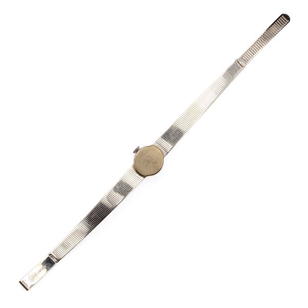 in oro bianco 18kt, cassa tonda 15 mm. contornata da diamanti taglio huit-huit, quadrante argentato, movimento meccanico a carica manuale, bracciale in oro bianco 18kt
