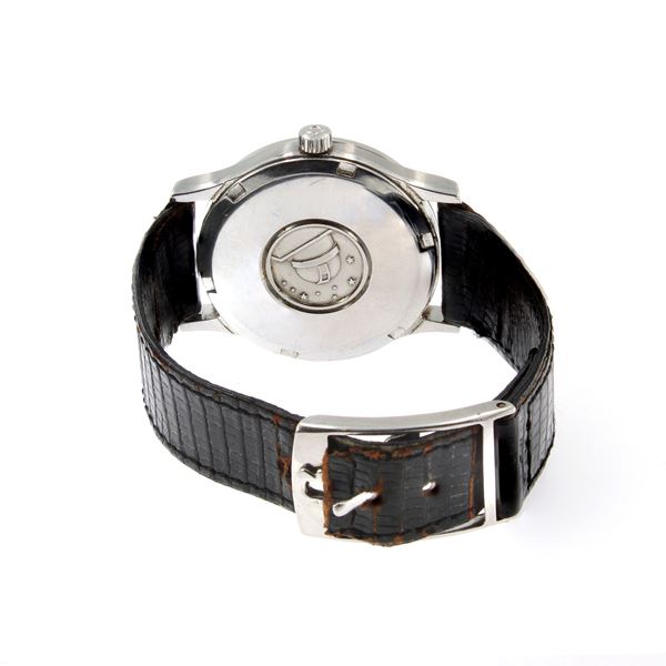 peso 37 gr.in acciaio, cassa tonda 38mm. quadrante argentato con indici, datario ore 3, movimento meccanico a carica automatica completo di cinturino con fibbia