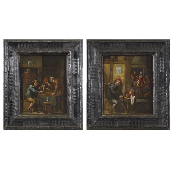 32x24,5 cm."Jeau de Tric-Trac -Le dormeur", coppia di oli su tela, entro cornice