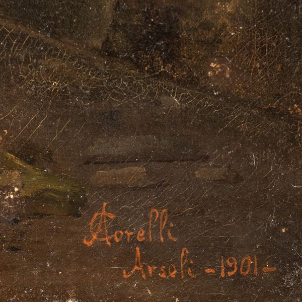 112x 99 cm."Arsoli", 1901, olio su tela, firmato, datato e titolato in basso a destra, entro cornice