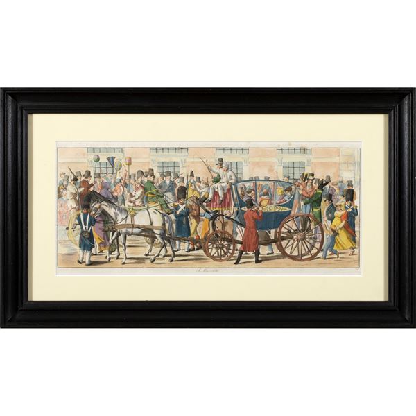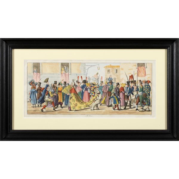 21x46 cm."Il Corso - I Moccoletti", 1820, coppia di acqueforti acquarellate, entro cornici