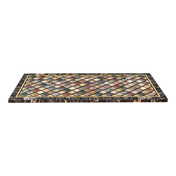 153x78 cm.corpo rettangolare lastronato in marmi vari, bordo in nero del Belgio, giallo di Siena e Portoro