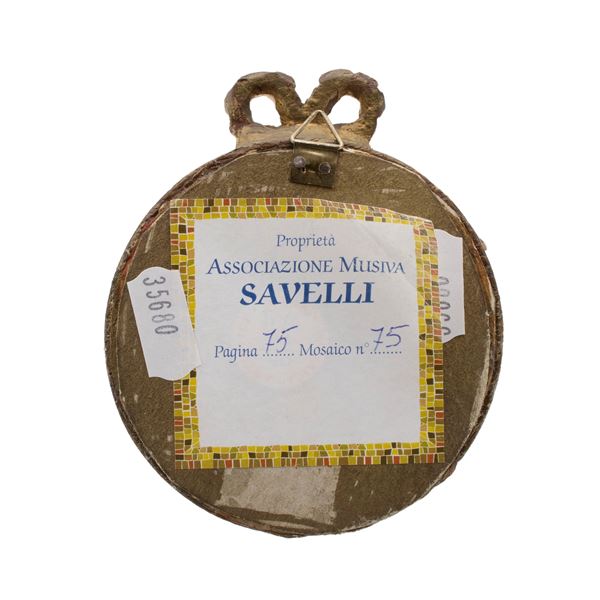 d. 6 cm.raffigurante "Cesta di fiori con coppia di colombe", entro cornice in legno dorato, 11x9 cm.