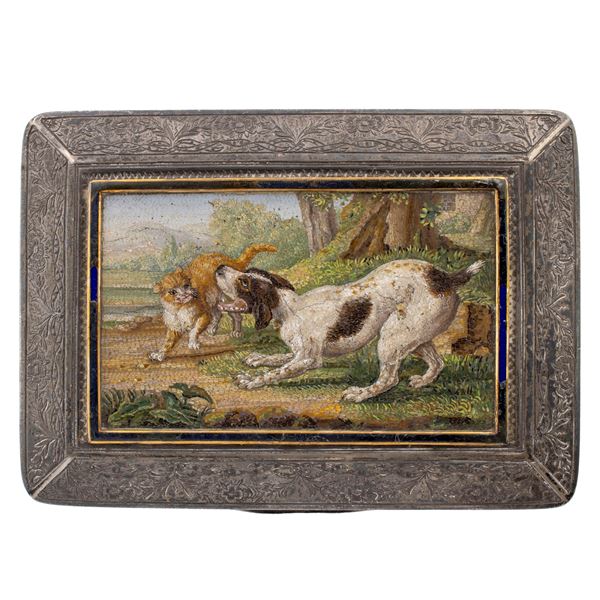 2x10x7 cm.di forma rettangolare con micromosaico raffigurante "Combattimento tra cane e gatto".
