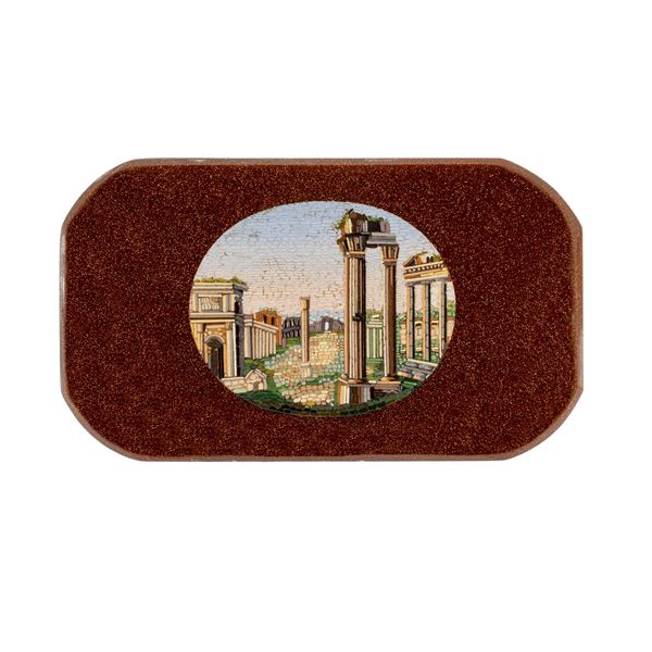 di forma ottagonale con placca ovale in micromosaico raffigurante "Il Foro Romano", orafo Luigi Mascelli, battuta in argento, restauri