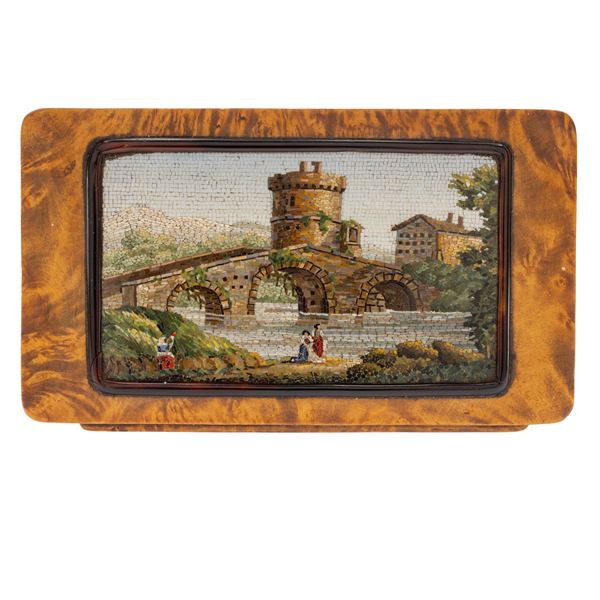 3x9x5,4 cm.di forma rettangolare con placca in micromosaico raffigurante il "Ponte Lucano con personaggi sulla riva dell'Aniene"