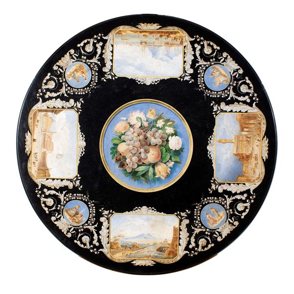 77x86 cm.piano circolare in scagliola raffigurante una composizione di frutta, fiori e farfalle al centro, contornata da quattro vedute di città raffiguranti Venezia, Firenze, Napoli e il Monte San Pellegrino a Palermo entro riserve riccamente abbellite da racemi e ghirlande ed alternate da rappresentazioni di costumi paesani; fusto a balaustro su quattro gambe mosse a formare grandi volute, intarsiati a girali floreali; reca l’etichetta “Pierre Della Valle & freres" sul retro del piano.