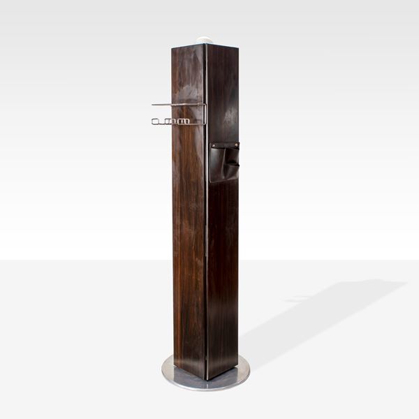 h. 200 cm.mobile contenitore girevole in legno, metallo, pelle, vetro specchiato e opalino, lievi usure