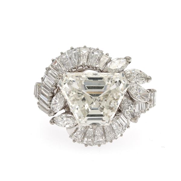 peso 10 gr.taglio a gradini, colore J - purezza VVS2, montato in oro bianco 18kt e diamanti taglio tapper, marquise e baguettes ct 2 circa, misura 7, completo di certificato gemmologico