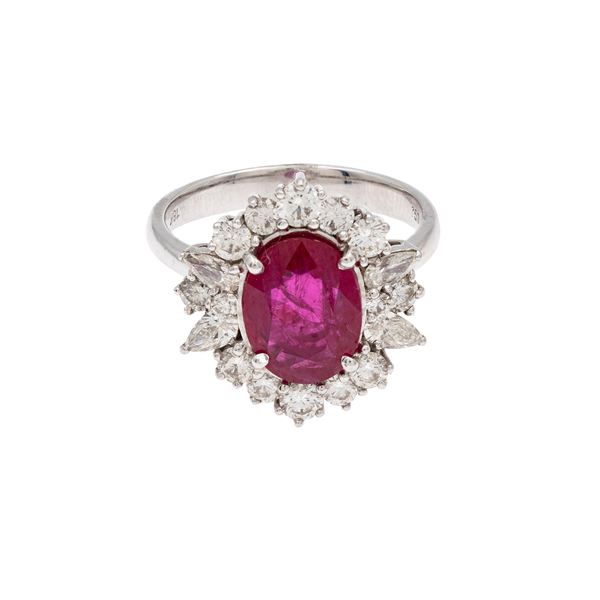 peso 7 gr.taglio ovale misto ct 2,69 circa, contornato da diamanti taglio a goccia e brillante ct 1,31 circa colore F/G - purezza VS/SI, misura 14,5, completo di certificato gemmologico