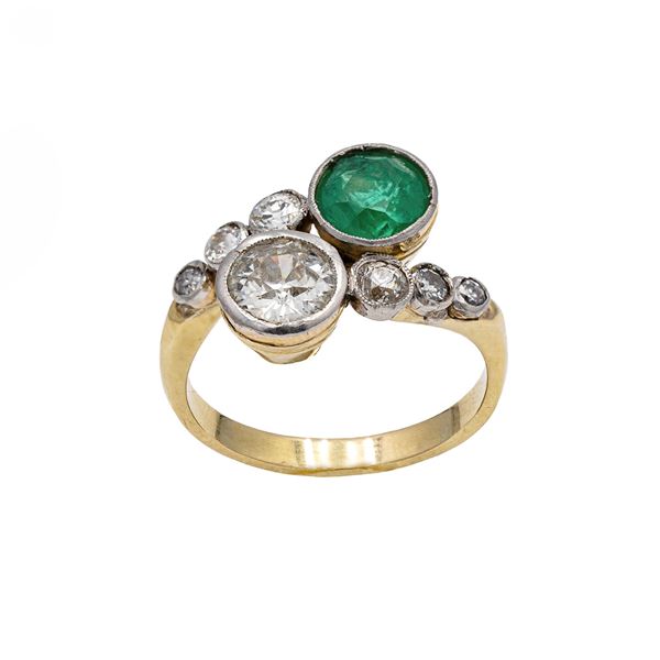 Antico anello contrarié in oro giallo e bianco 18kt con diamante e smeraldo