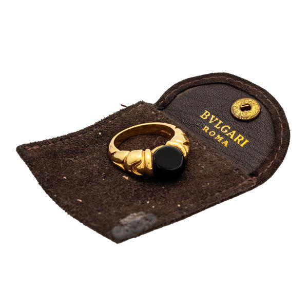 peso 9 gr.in oro giallo 18kt sormontato da una sfera in onice nero, misura 13, completo di custodia in tessuto