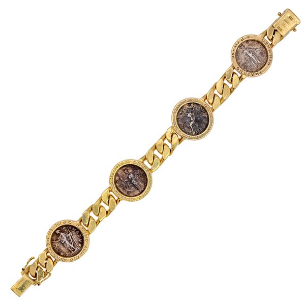 peso 82 gr.in oro giallo 18kt con quattro monete antiche in argento, lunghezza 18 cm.