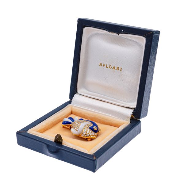 peso 10 gr.raffigurante pesce in oro giallo 18kt diamanti taglio brillante ct 1,80 circa e sezioni in lapislazzulo e madreperla, dimensioni 3,2x2 cm. completa di scatola