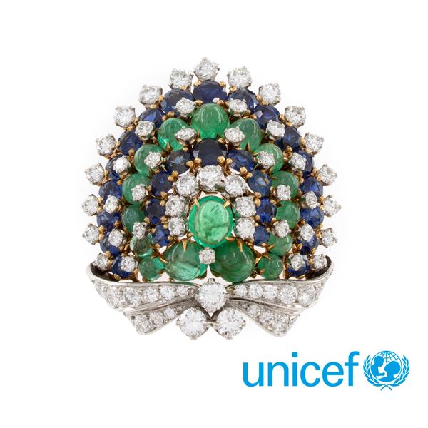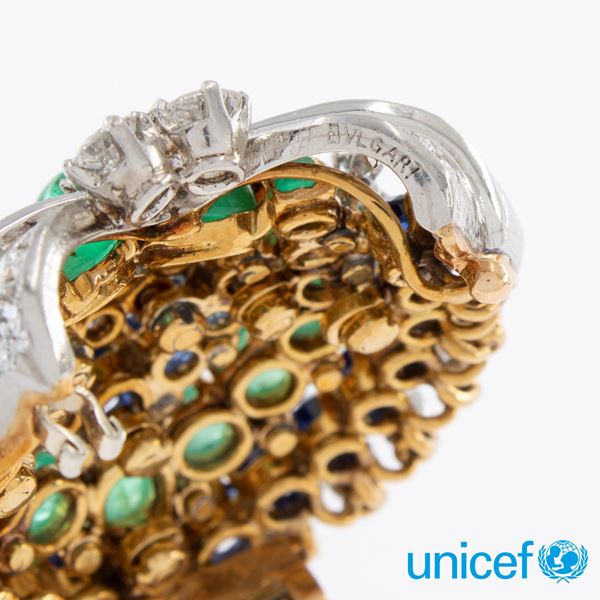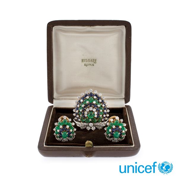 peso 48 gr.in oro giallo e bianco 18kt con smeraldi taglio cabochon, zaffiri tondi e diamanti taglio brillante ct 4 circa, dimensioni spilla 4x3,5 cm. - orecchini 2x2,2 cm. completa di scatola
