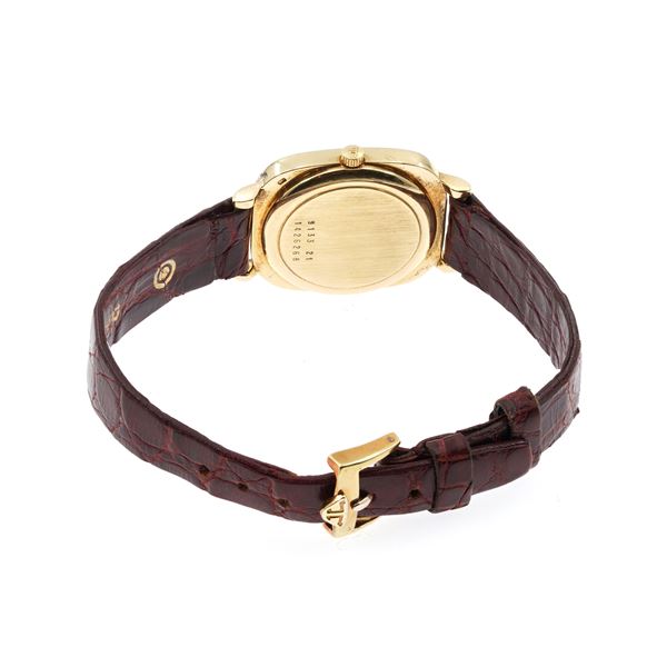 peso 25 gr.in oro giallo 18kt, ref. 913321 - 1426268, cassa ovale 27x28 mm. quadrante crema con numeri romani, vetro zaffiro, movimento meccanico a carica manuale, calibro 818, completo di cinturino con fibbia originale placcata oro, cassa quadrante e movimento firmati
