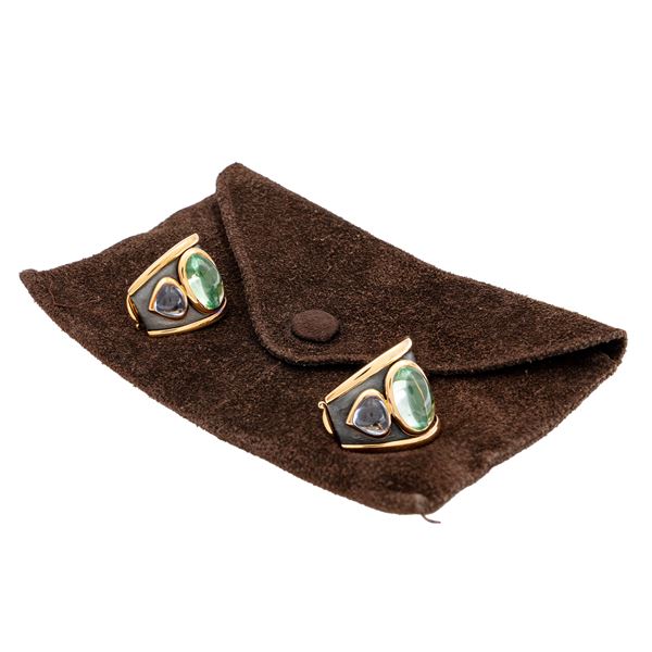 peso 26 gr.in oro giallo 18kt e oro brunito con zaffiro e prasiolite verde taglio cabochon, dimensioni 2,1x1,9 cm. completi di custodia in tessuto.