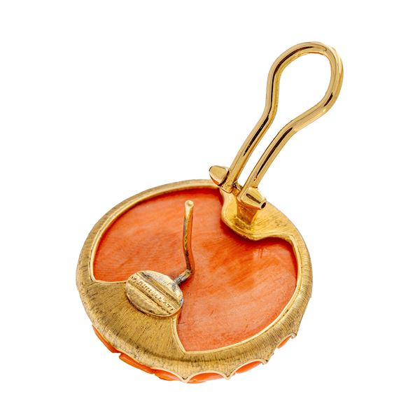 peso 27 gr.in oro giallo 18kt e corallo scolpito a motivo floreale, diametro 2,5 cm.