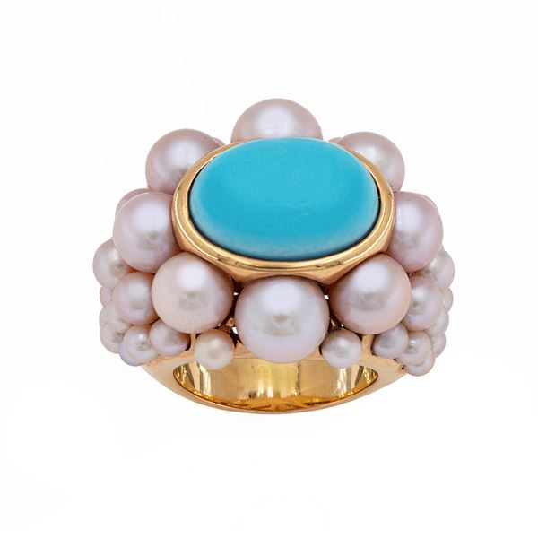 Mimi anello cocktail in oro giallo 18kt turchese e perle rosate