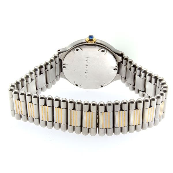 peso 59 gr.in acciaio e oro, ref. 901041846, cassa tonda 28 mm. ghiera con incisi numeri romani dorati, quadrante crema senza indici, corona in oro giallo con zaffiro, movimento al quarzo cartier 81, bracciale originale in acciaio e oro con chiusura deployante, cassa, quadrante e movimento firmati