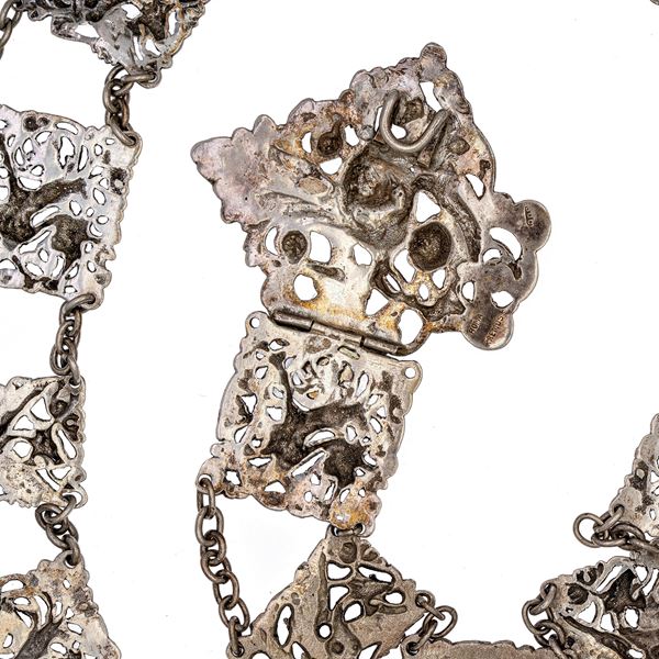 peso 208 gr.sbalzato ed inciso a raffigurare draghi, chiusura con figura antropomorfa, lunghezza 78 cm.