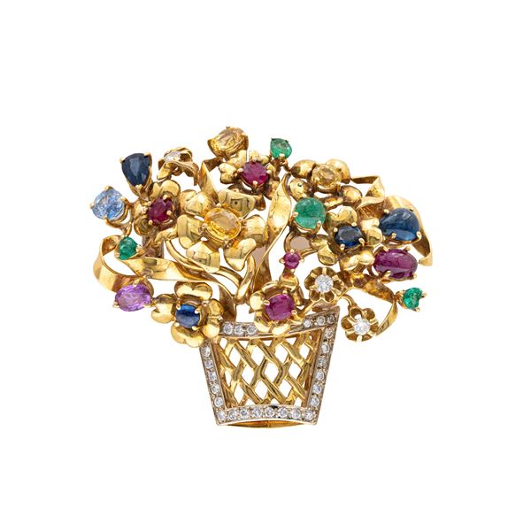 peso 49 gr.in oro giallo 18kt zaffiri blu e rosa, rubini, smeraldi di taglio diverso e diamanti taglio brillante ct 1,20 circa, dimensioni spilla 4,9x5 cm. - orecchini 2,7x2,6 cm.