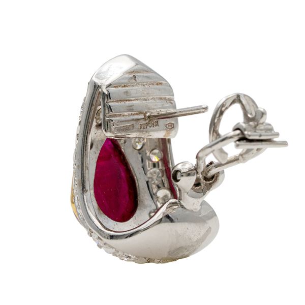 peso 18 gr.due rubini a goccia taglio cabochon ct 6 circa contornati da diamanti taglio brillante ct 2,70 circa, lunghezza 3 cm.