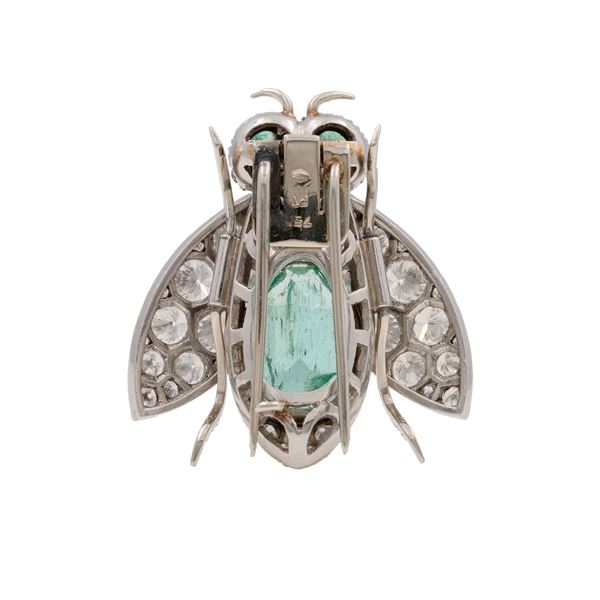 peso 14 gr.taglio a cuscino ct 3,10 circa, diamanti taglio brillante e huit-huit ct 4,70 circa colore G/H - purezza VS, occhi con due smeraldi, dimensioni 3,5x2,9 cm. completa di certificato gemmologico