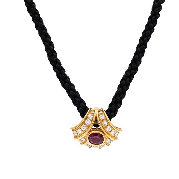 peso 17 gr.rubino taglio a cuscino ct 2 circa, contornato da diamanti taglio brillante ct 1,30 circa, dimensioni 2,8x2,3 cm. - pendente removibile in oro giallo con perla a goccia e diamanti taglio baguettes, due pietre mancanti, completa di cordoncino in tessuto con chiusura in oro giallo e scatola