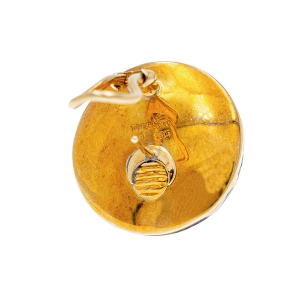 peso 24 gr.in oro giallo 18kt con incastonate sezioni in lapislazzulo e madreperla alternati, diametro 2,5 cm.