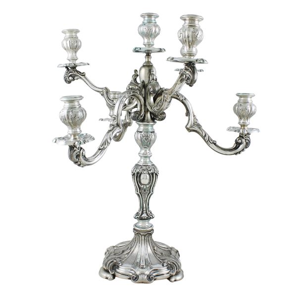 65x50x50 cm.orafo Ditta F.lli Leone Milano, fusto tornito con bracci a doppia voluta, base di linea mossa poggiante su quattro piedini sagomati