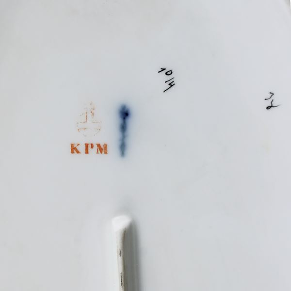 30x35x22 cm.di forma ovale decorata con motivi floreali ed applicazioni in rilievo, manici a voluta, presa del coperchio a foggia di putto con cornucopia, merchio della produzione, lievi difetti
