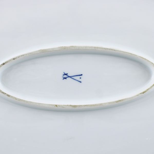 47x36 cm. - 40x30 cm.in porcellana policroma su fondo bianco con profilo dorato, decoro floreale con insetti, bordo Ozier in rilievo, marchio della produzione, lievi difetti