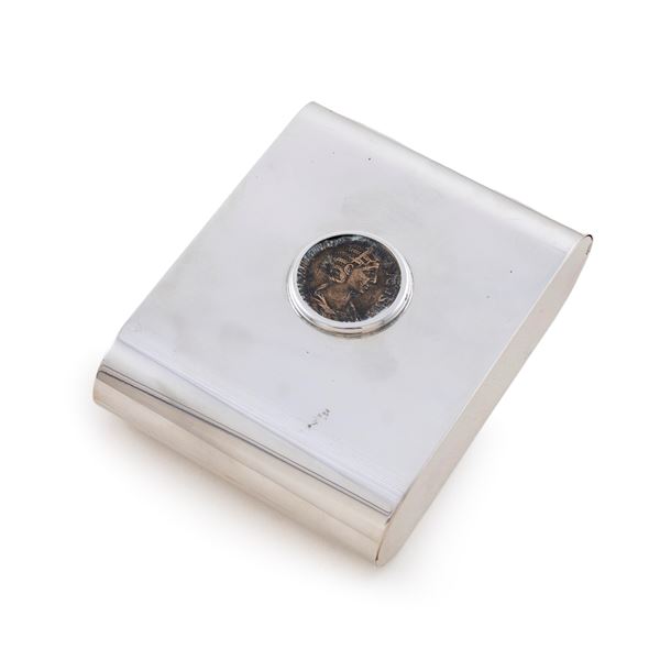 3x11,5x9 cm.orafo Ubaldo San Donai, Treviso, corpo liscio, coperchio centrato da una moneta in rame, peso 308 gr.